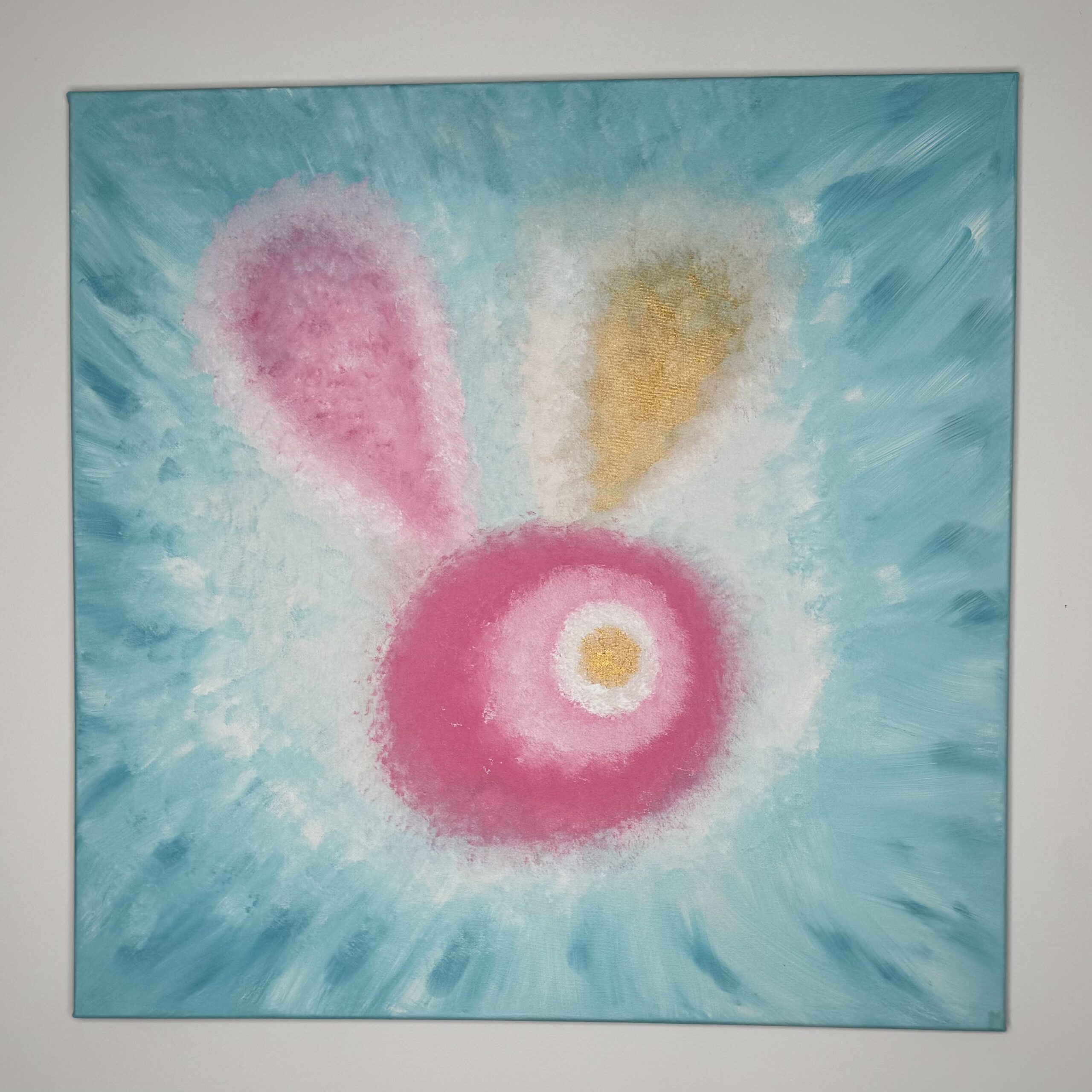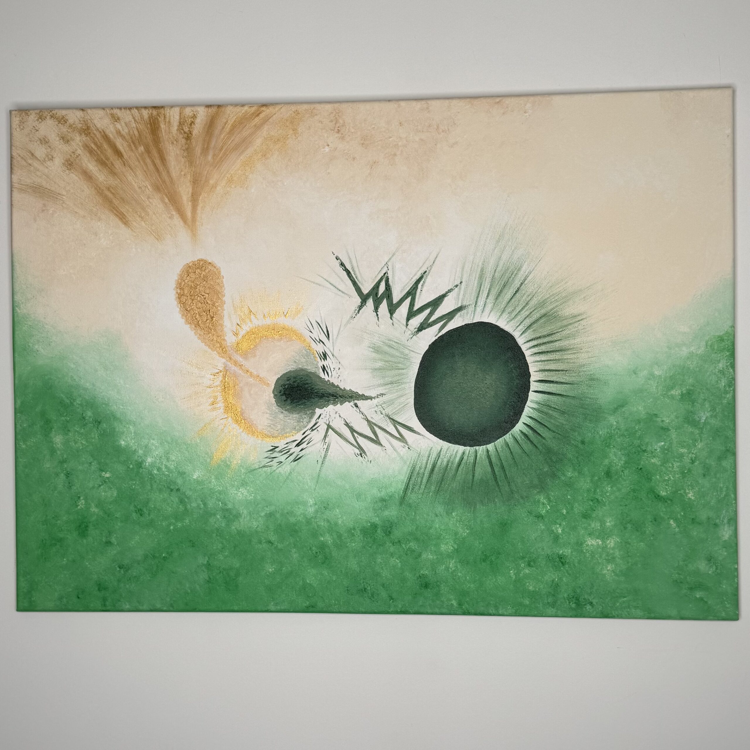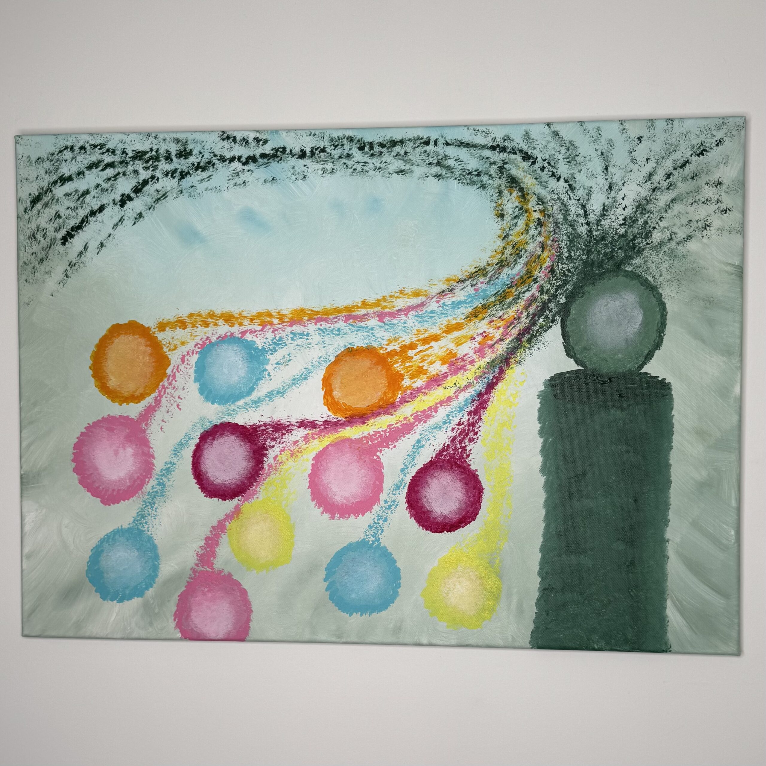 Kiedy malowałam ten obrazek to w miejscu czarnej kropki usiadła mała muszka owocówka. Nie wiedziałam jeszcze jaki będzie przekaz tego obrazu, to mucha go przyniosła. My ludzie jesteśmy jak ta mucha, przykleiliśmy się do ziemskiego świata, nie potrafimy