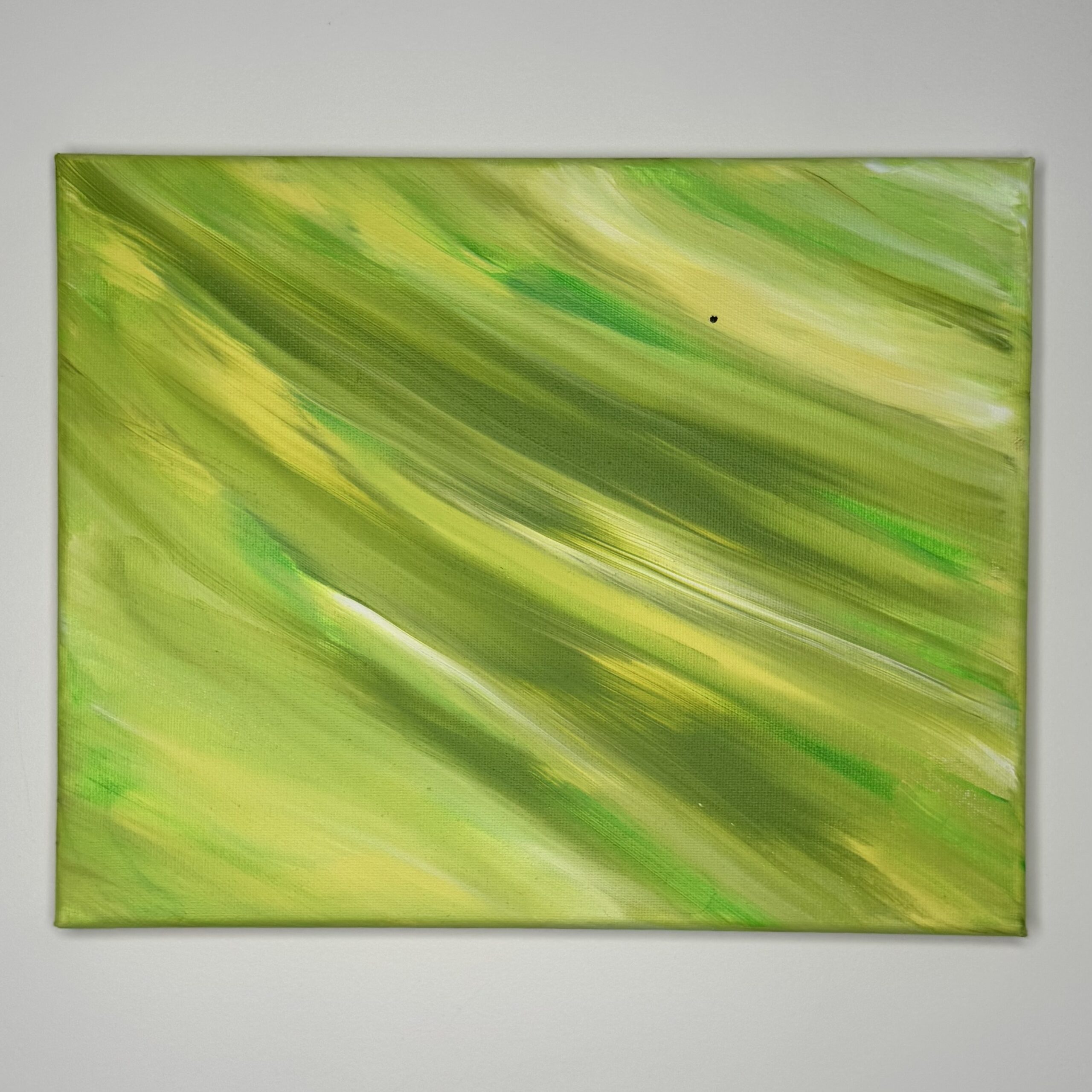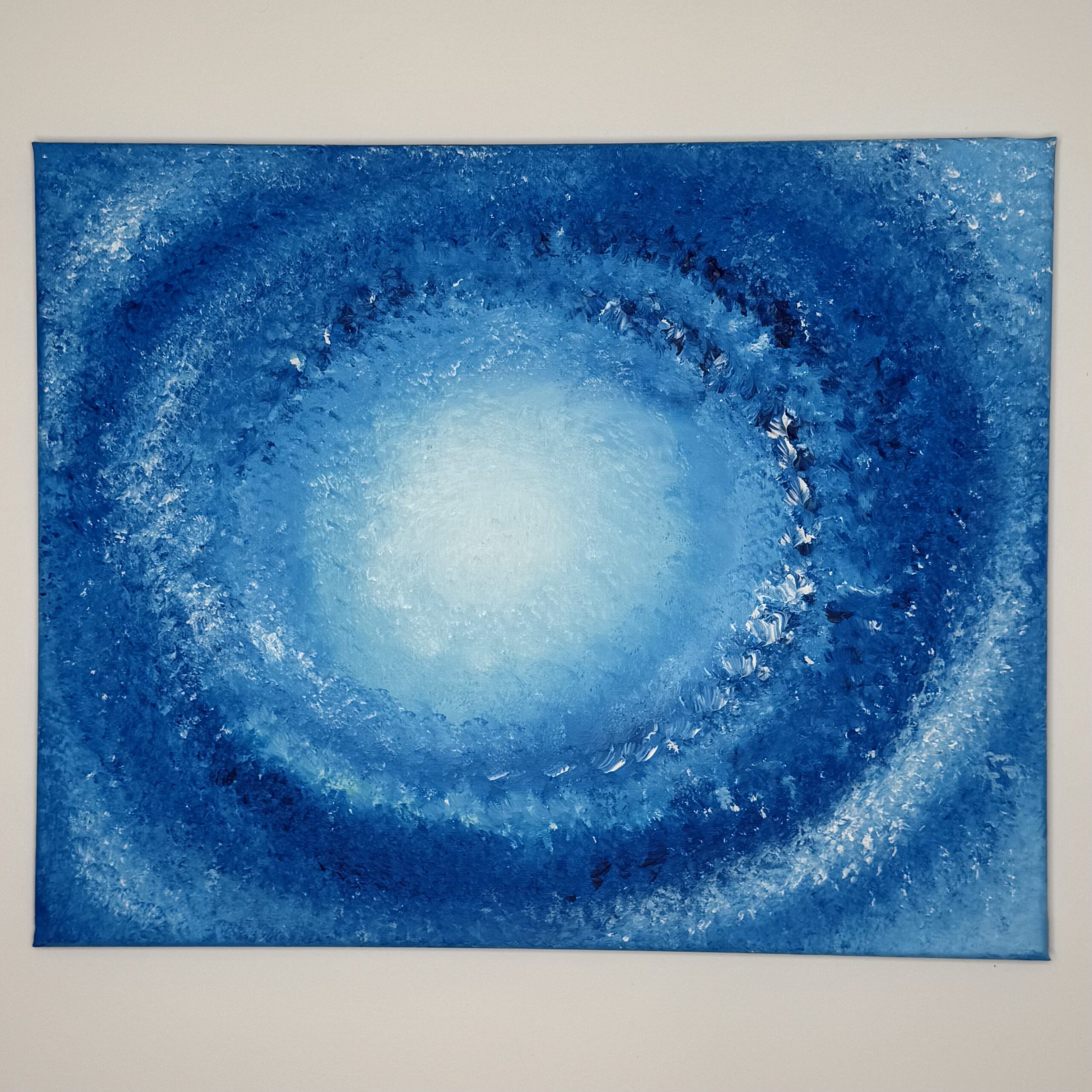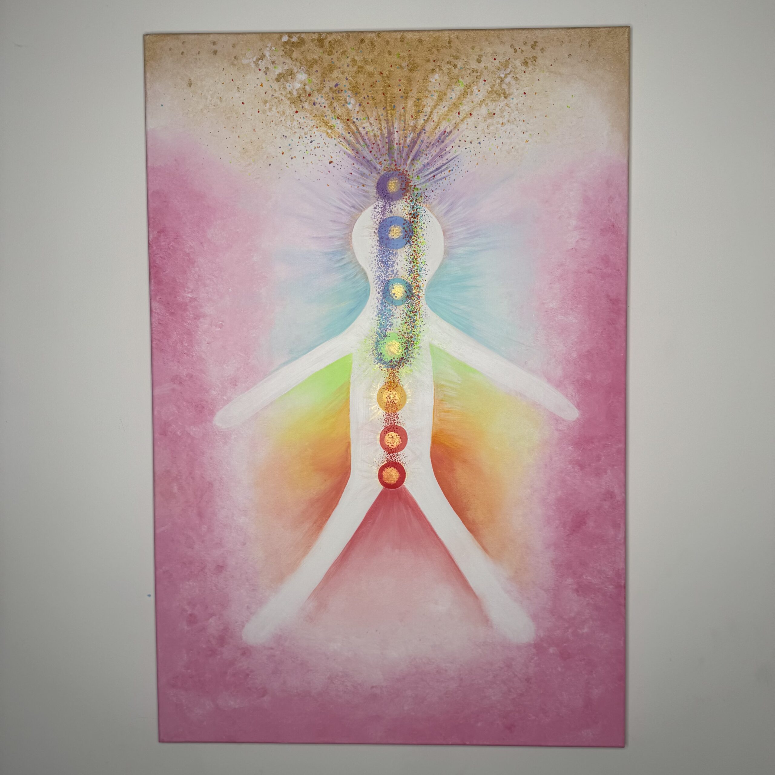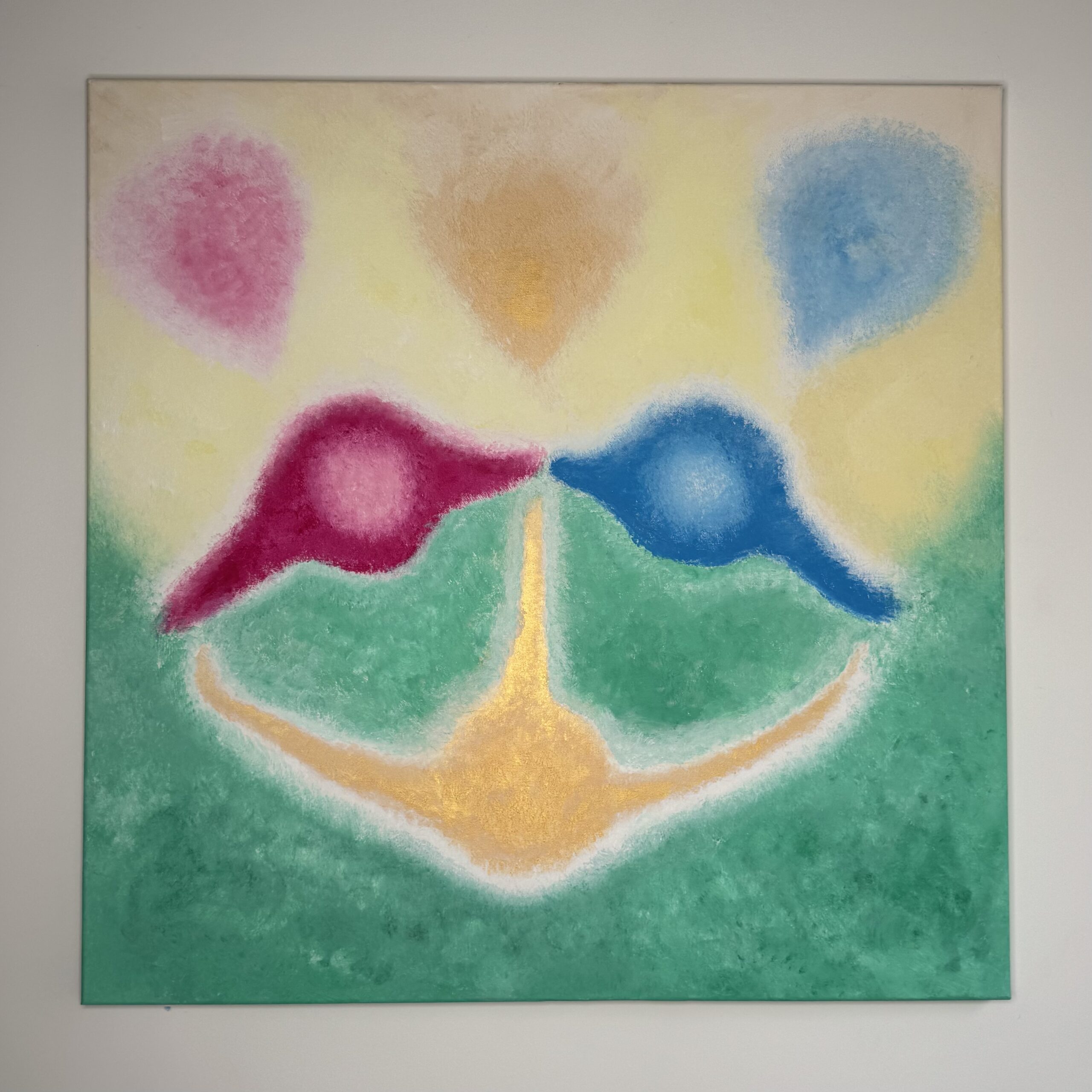 Kiedy malowałam ten obrazek to w miejscu czarnej kropki usiadła mała muszka owocówka. Nie wiedziałam jeszcze jaki będzie przekaz tego obrazu, to mucha go przyniosła. My ludzie jesteśmy jak ta mucha, przykleiliśmy się do ziemskiego świata, nie potrafimy